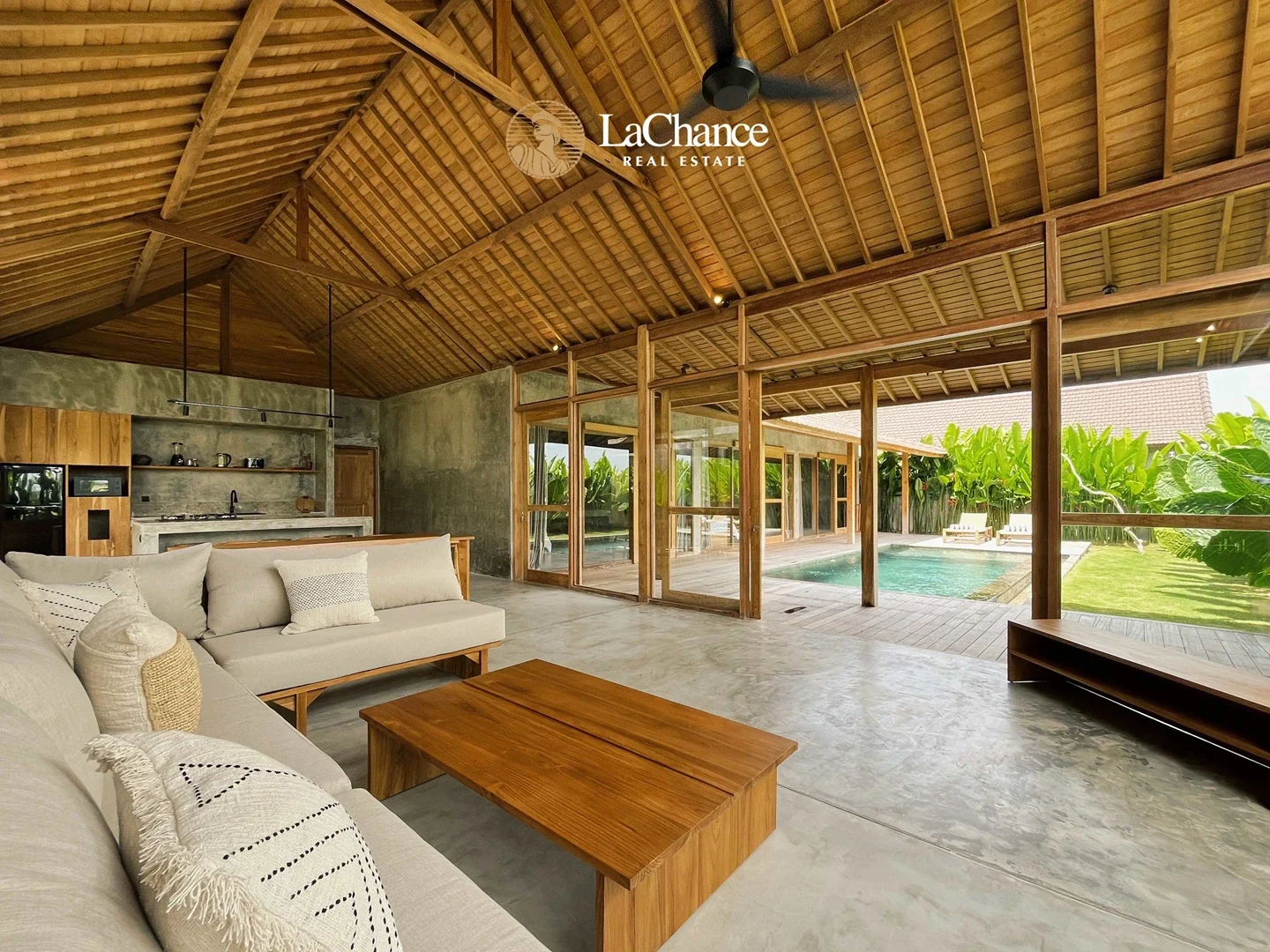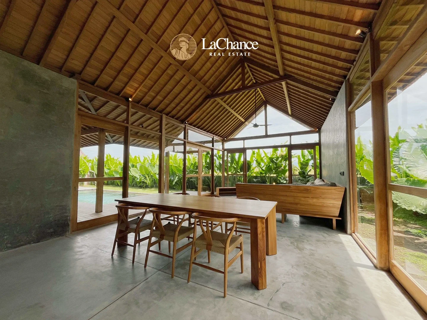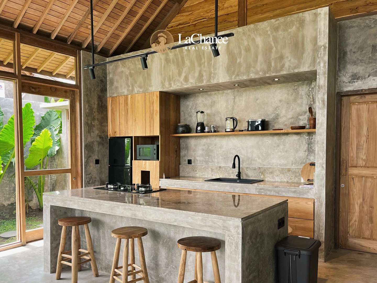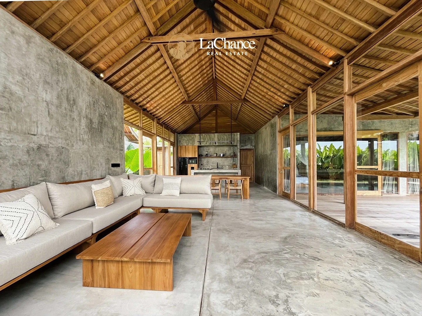 The villa’s design is a fascinating fusion of traditional tropical architecture and modern industrial elements. The structure is almost entirely crafted in wood, creating warmth and character, while large glass panels allow natural light to flood the interiors. Polished concrete floors and industrial finishes add a contemporary edge, perfectly balanced with the natural wood and teak exterior details.
