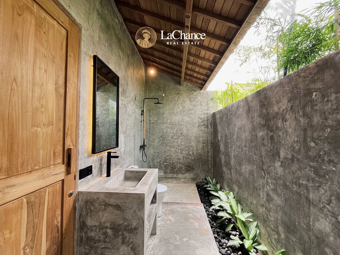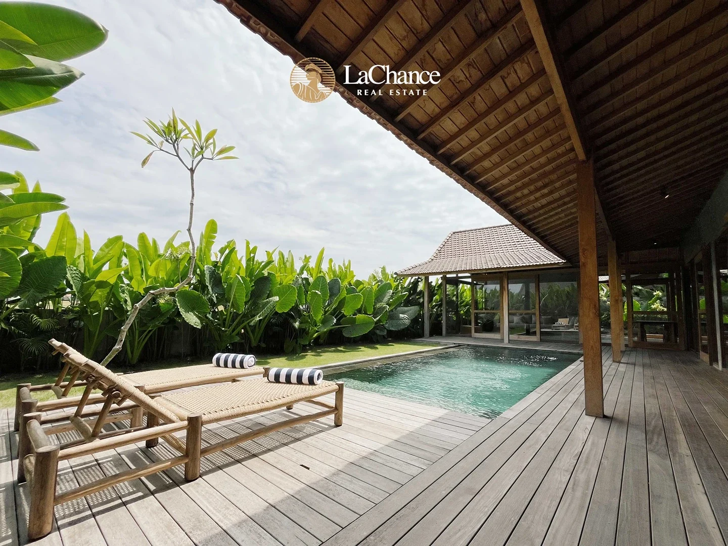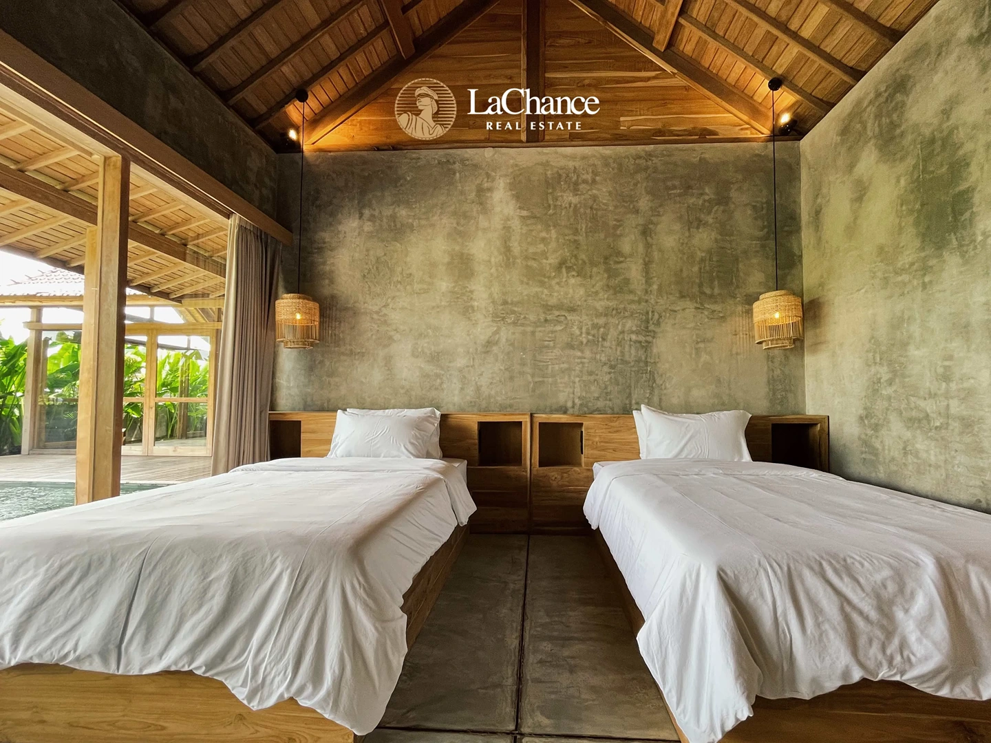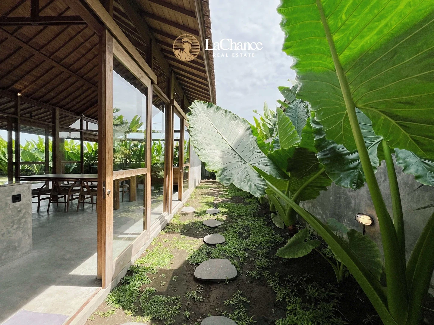 The villa’s design is a fascinating fusion of traditional tropical architecture and modern industrial elements. The structure is almost entirely crafted in wood, creating warmth and character, while large glass panels allow natural light to flood the interiors. Polished concrete floors and industrial finishes add a contemporary edge, perfectly balanced with the natural wood and teak exterior details.