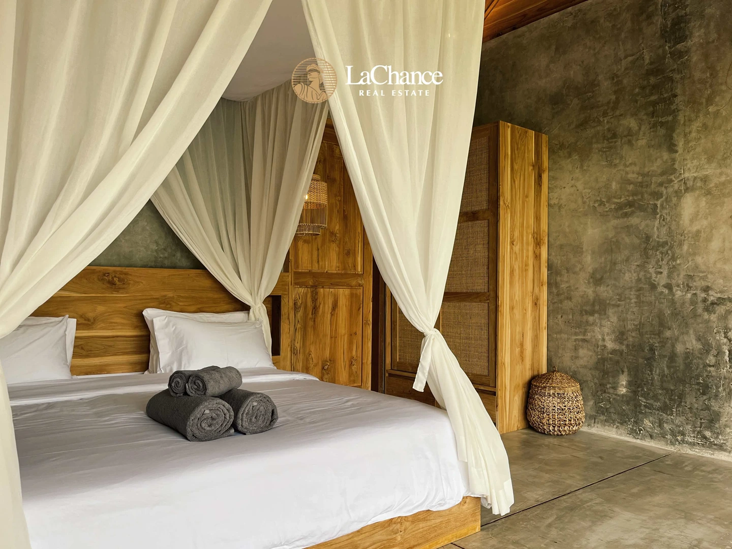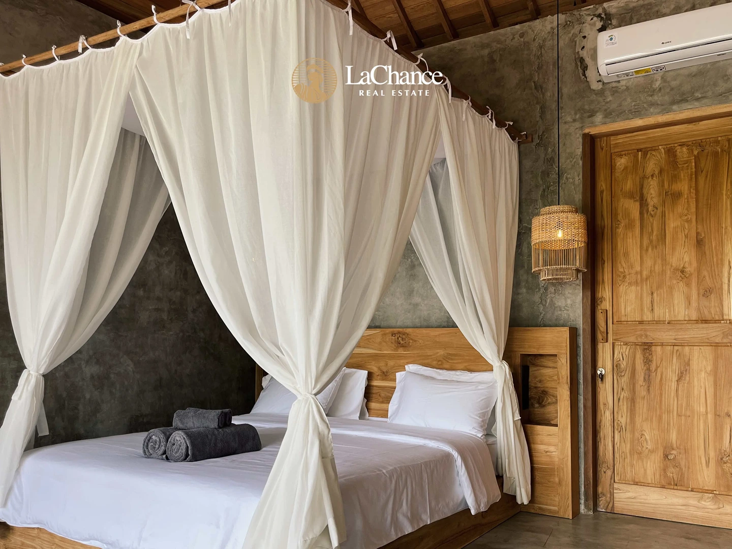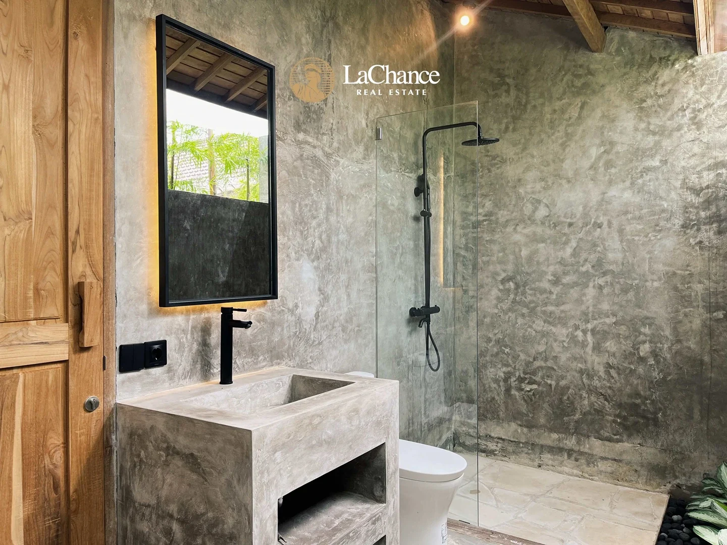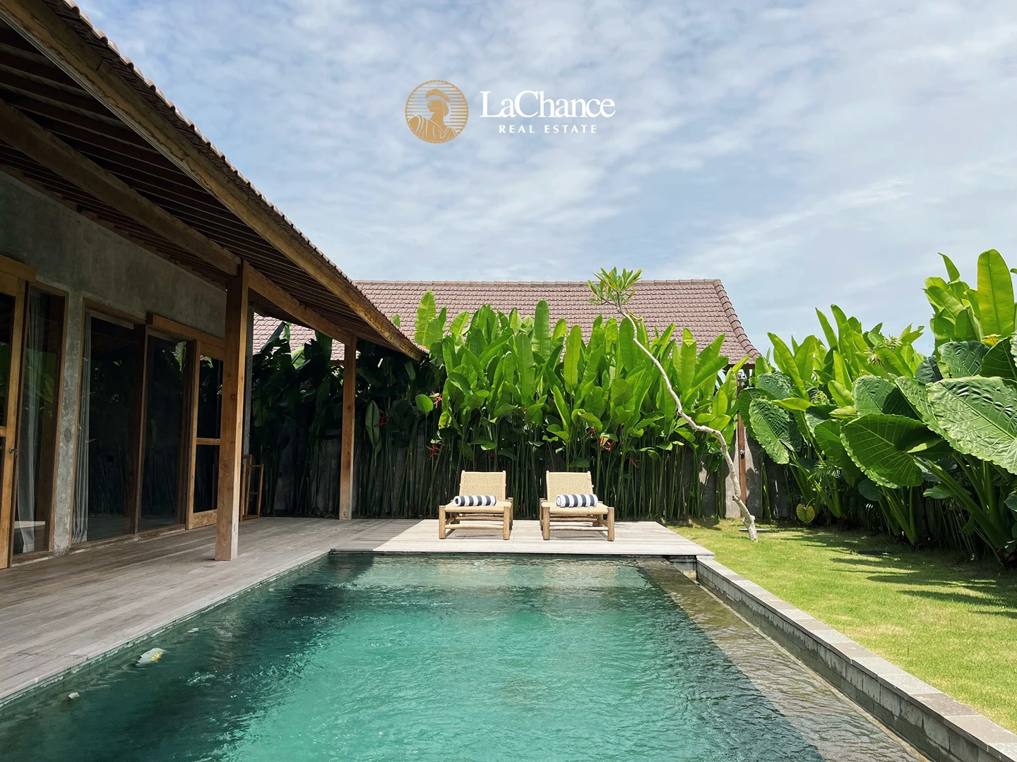 The villa’s design is a fascinating fusion of traditional tropical architecture and modern industrial elements. The structure is almost entirely crafted in wood, creating warmth and character, while large glass panels allow natural light to flood the interiors. Polished concrete floors and industrial finishes add a contemporary edge, perfectly balanced with the natural wood and teak exterior details.