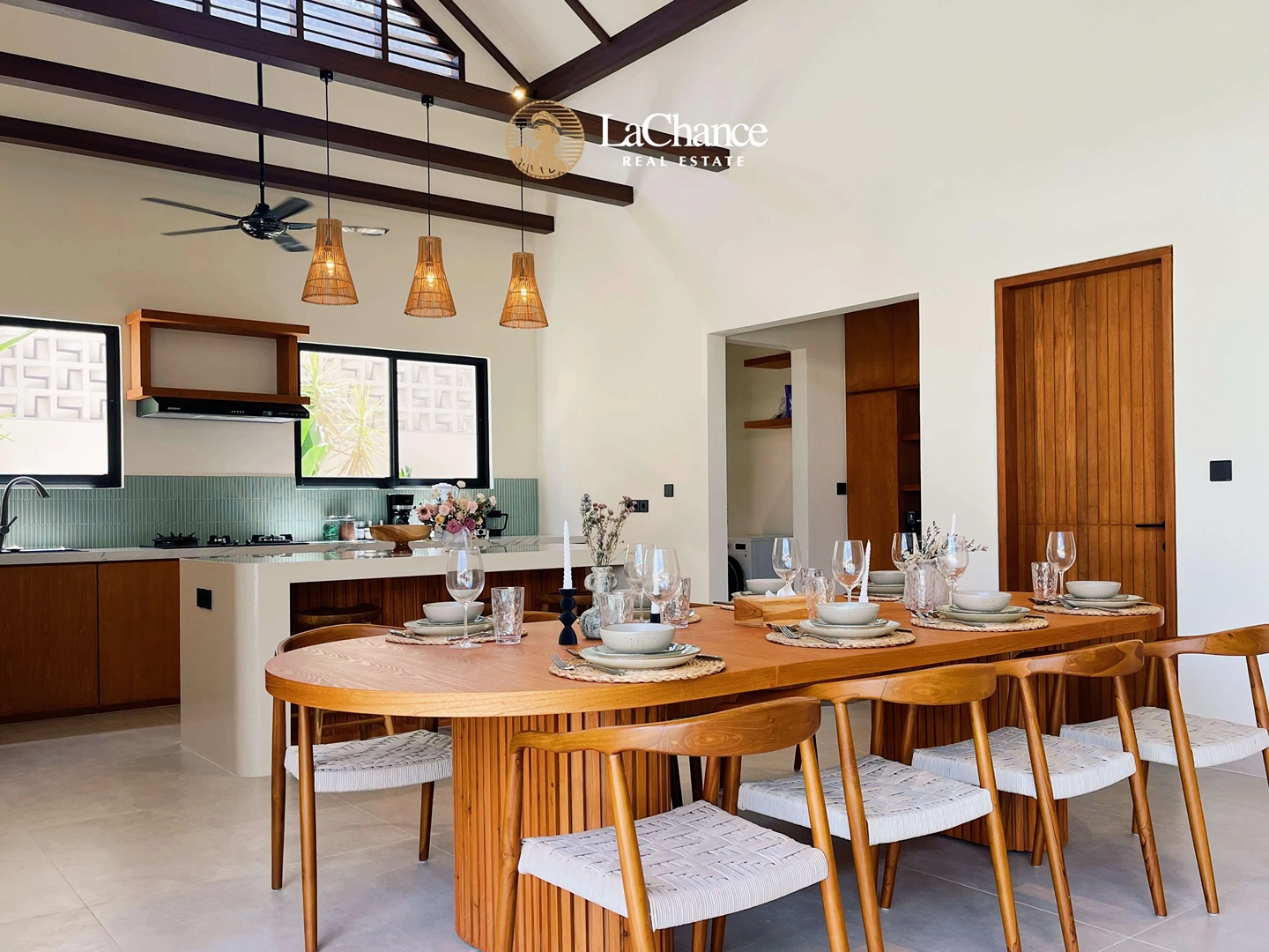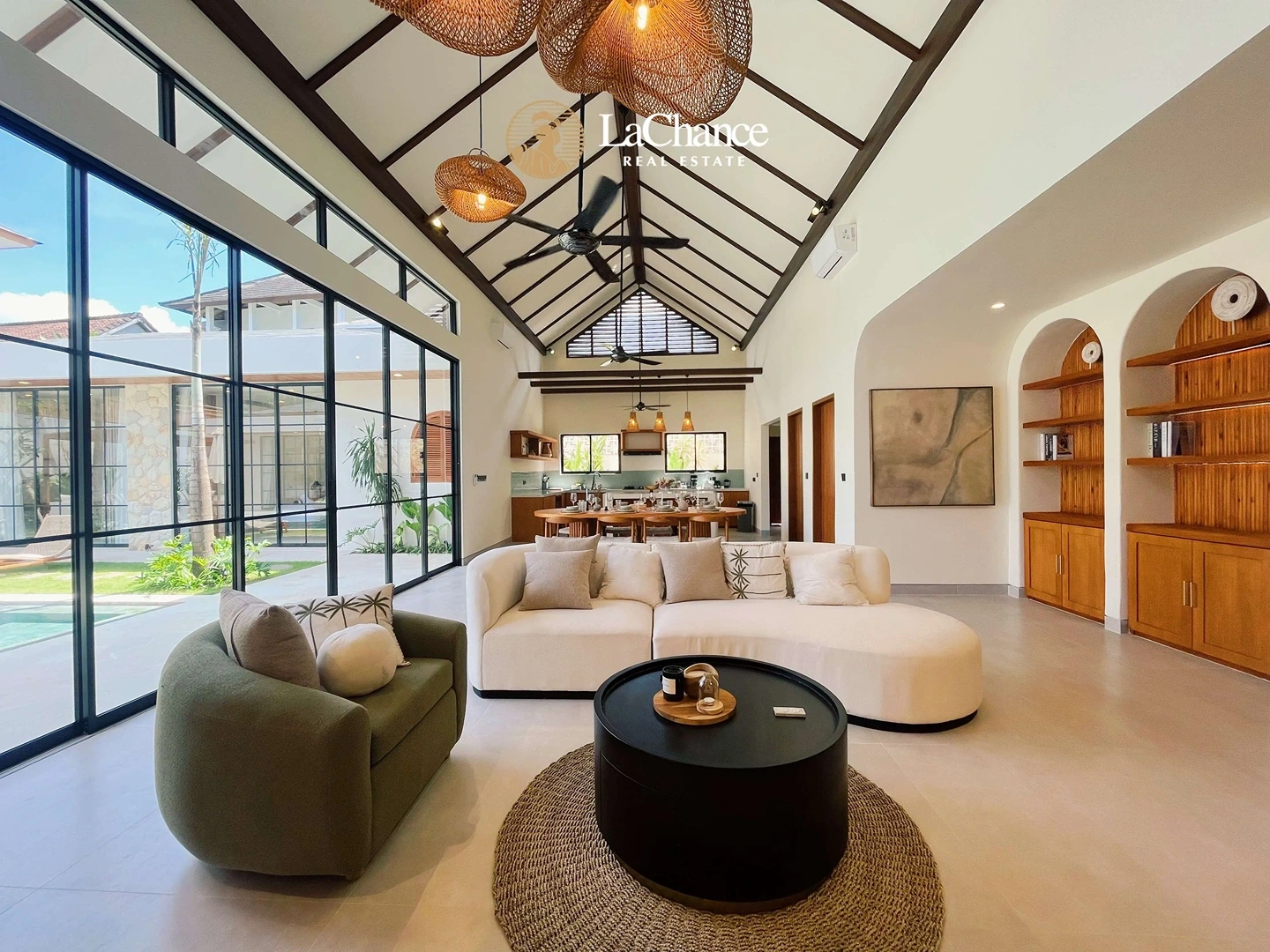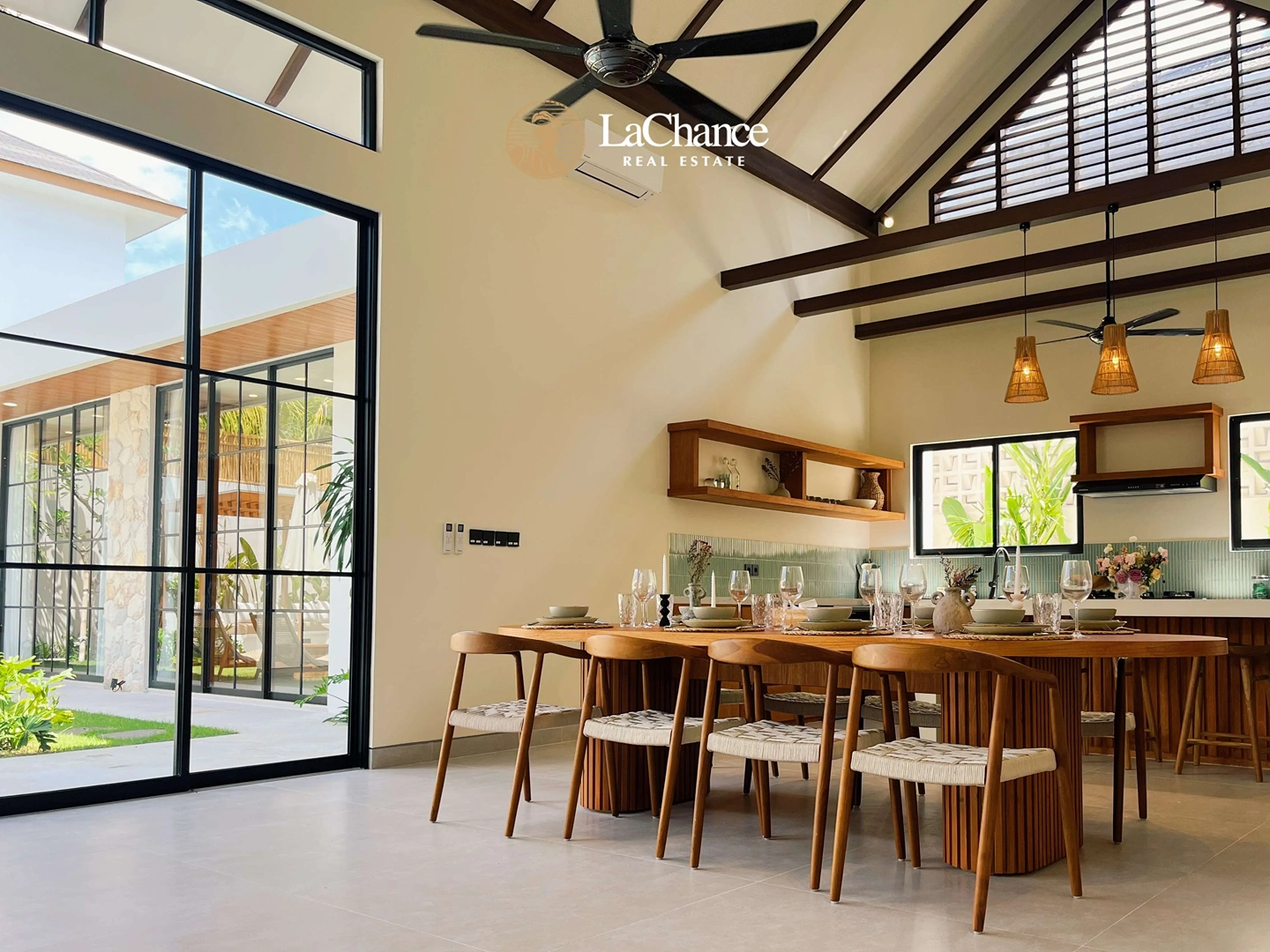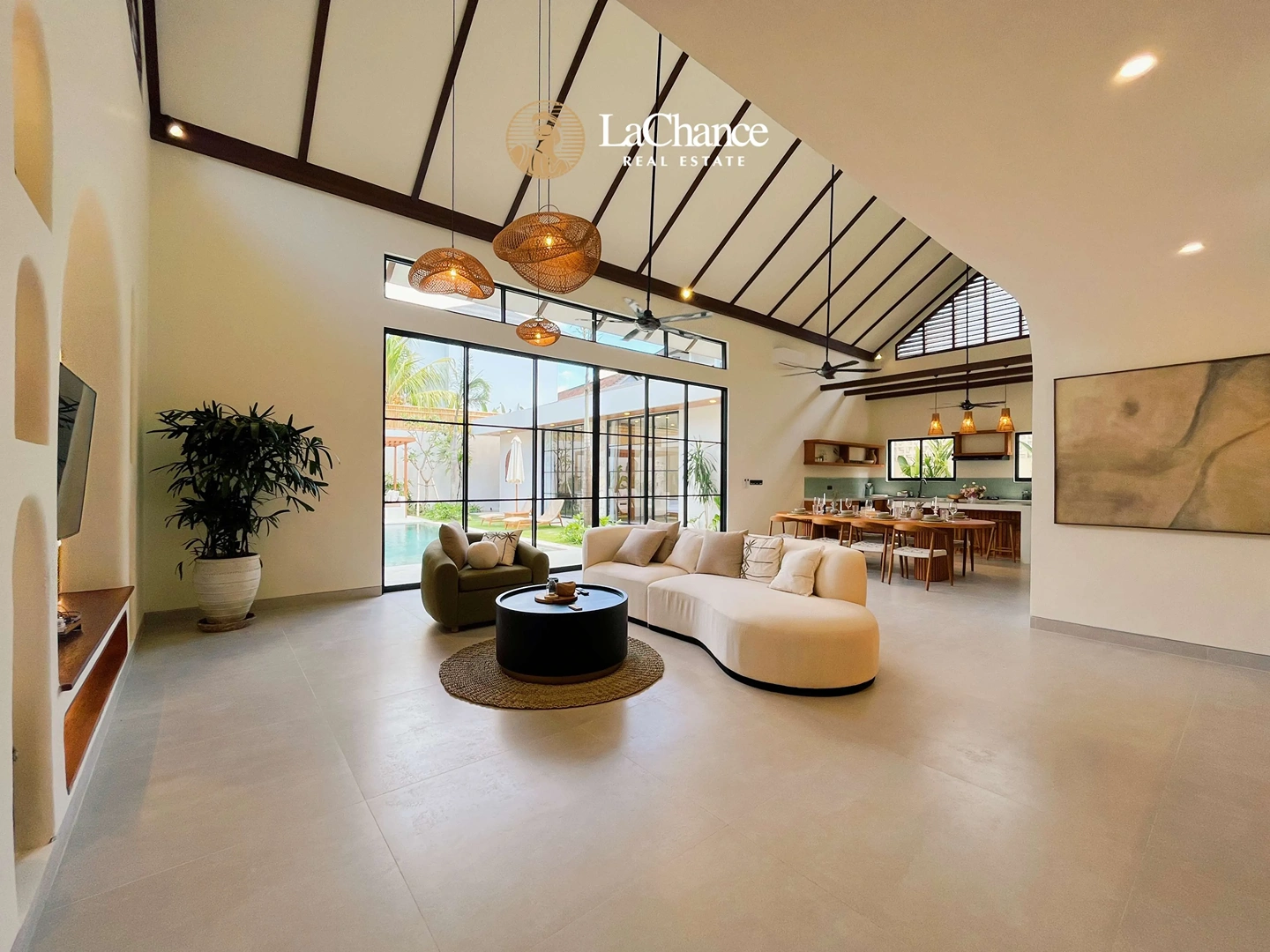 The heart of the home is defined by its striking 6.5-meter ceiling height, creating a bright and expansive enclosed living and dining area. Fully air-conditioned, this space combines openness with everyday comfort, flowing effortlessly into the outdoor area where a 4 x 8 meter private swimming pool and a covered cabana provide the perfect setting for relaxation and entertaining.