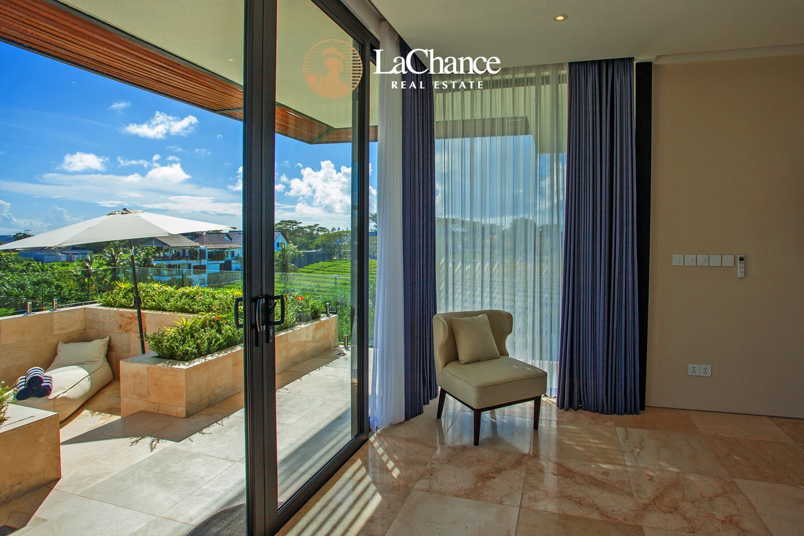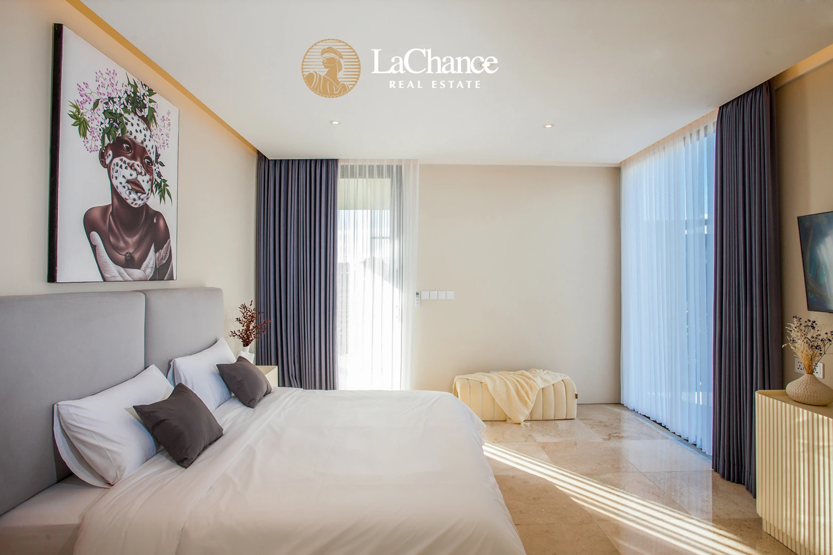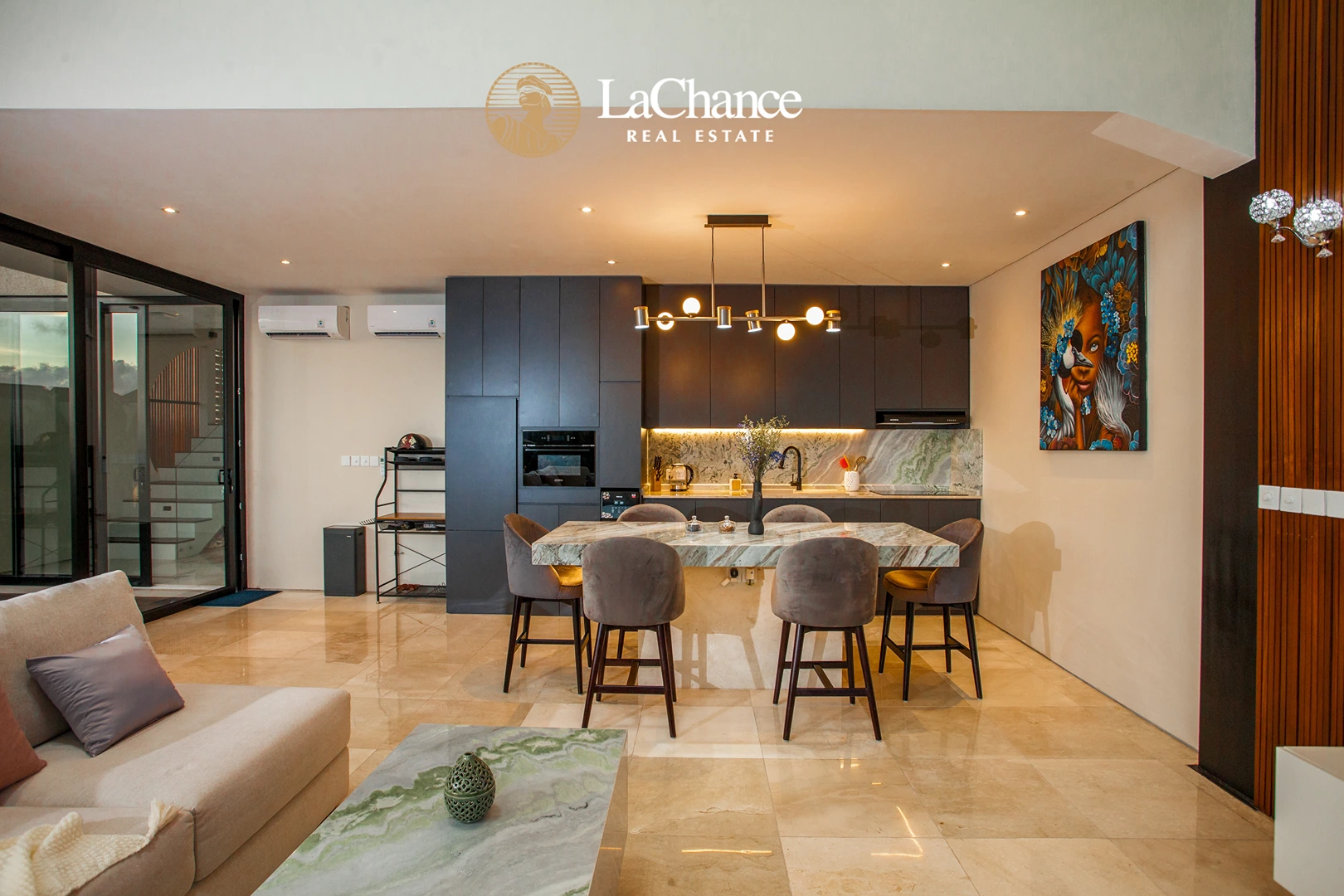 The villa features four spacious bedrooms, all with en-suite bathrooms, each designed with a refined aesthetic and large glass windows that frame stunning views from multiple angles. The ground floor offers a beautiful enclosed living room and a fully equipped kitchen, creating the perfect space for gathering, entertaining, and sharing unforgettable moments.
