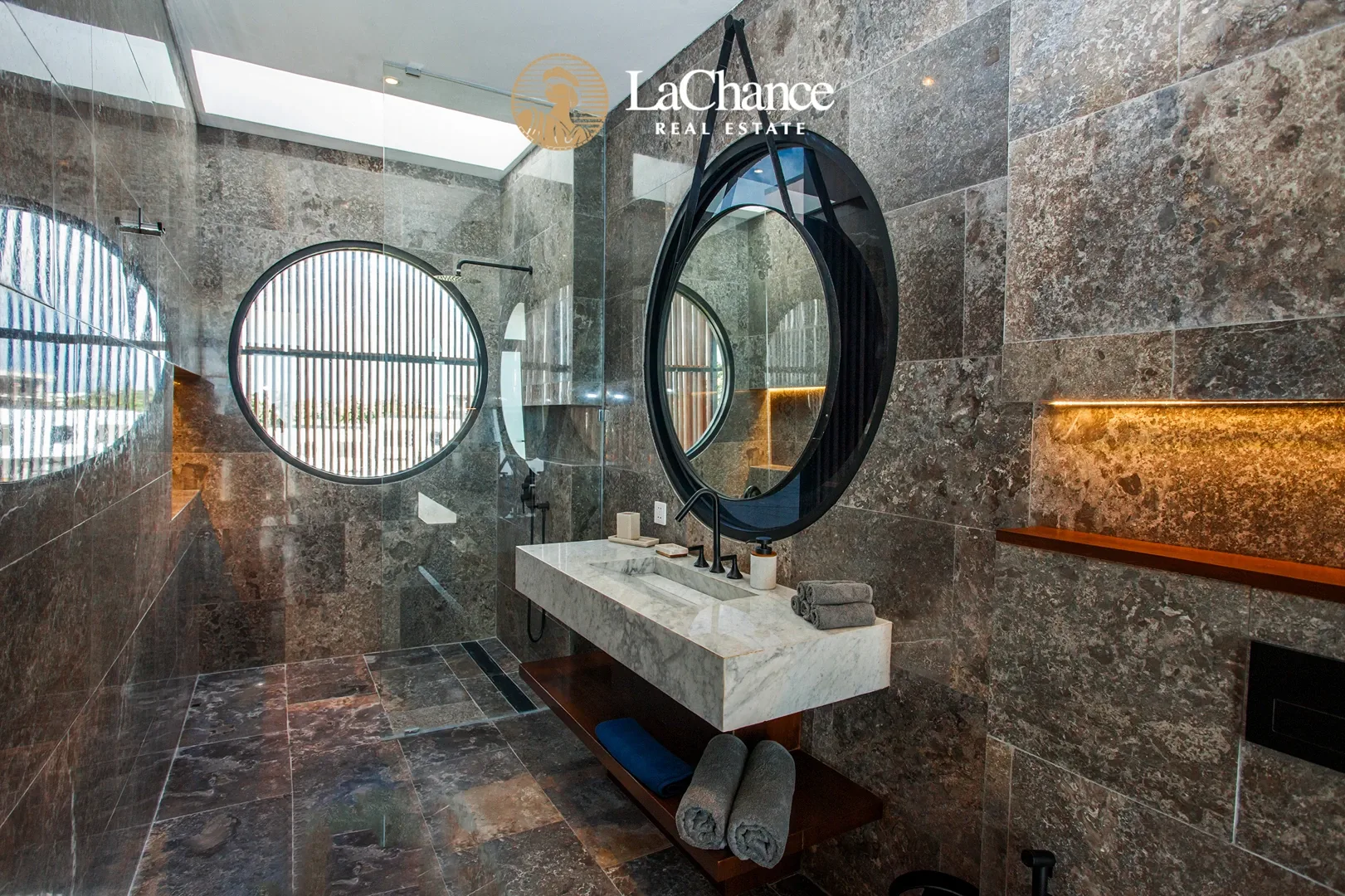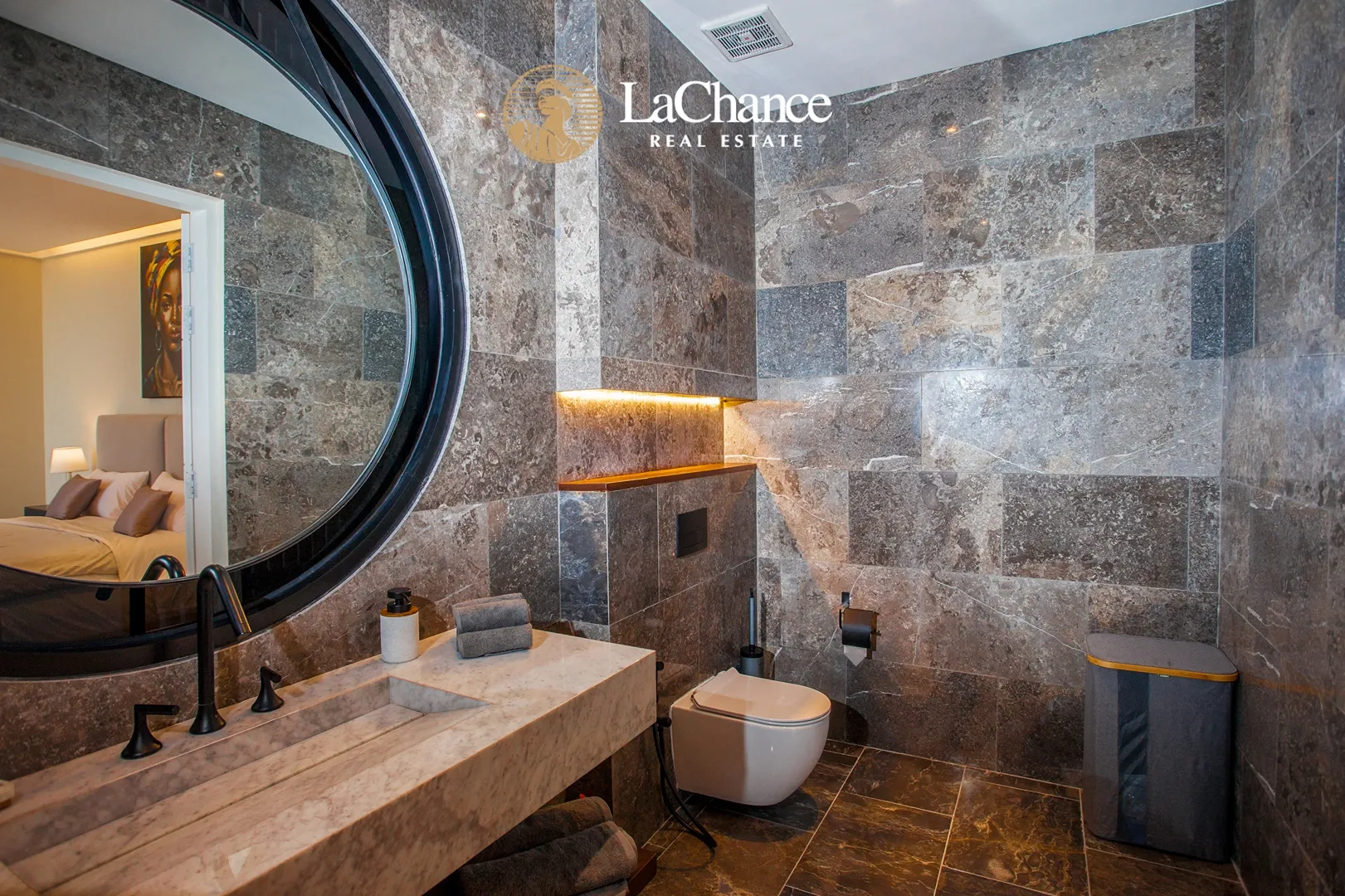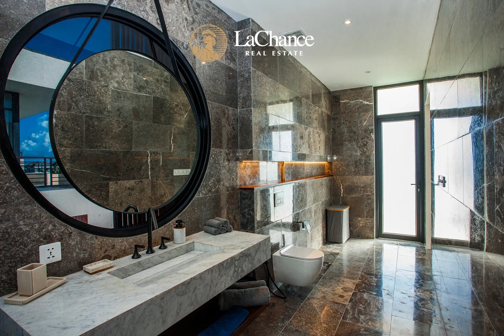 The quality of materials throughout the villa is exceptional. Extensive marble finishes, high-end technology, thick soundproof glass panels, and soaring ceilings create an atmosphere of refined elegance and absolute comfort. Every detail has been carefully curated to deliver a sense of sophistication and durability.