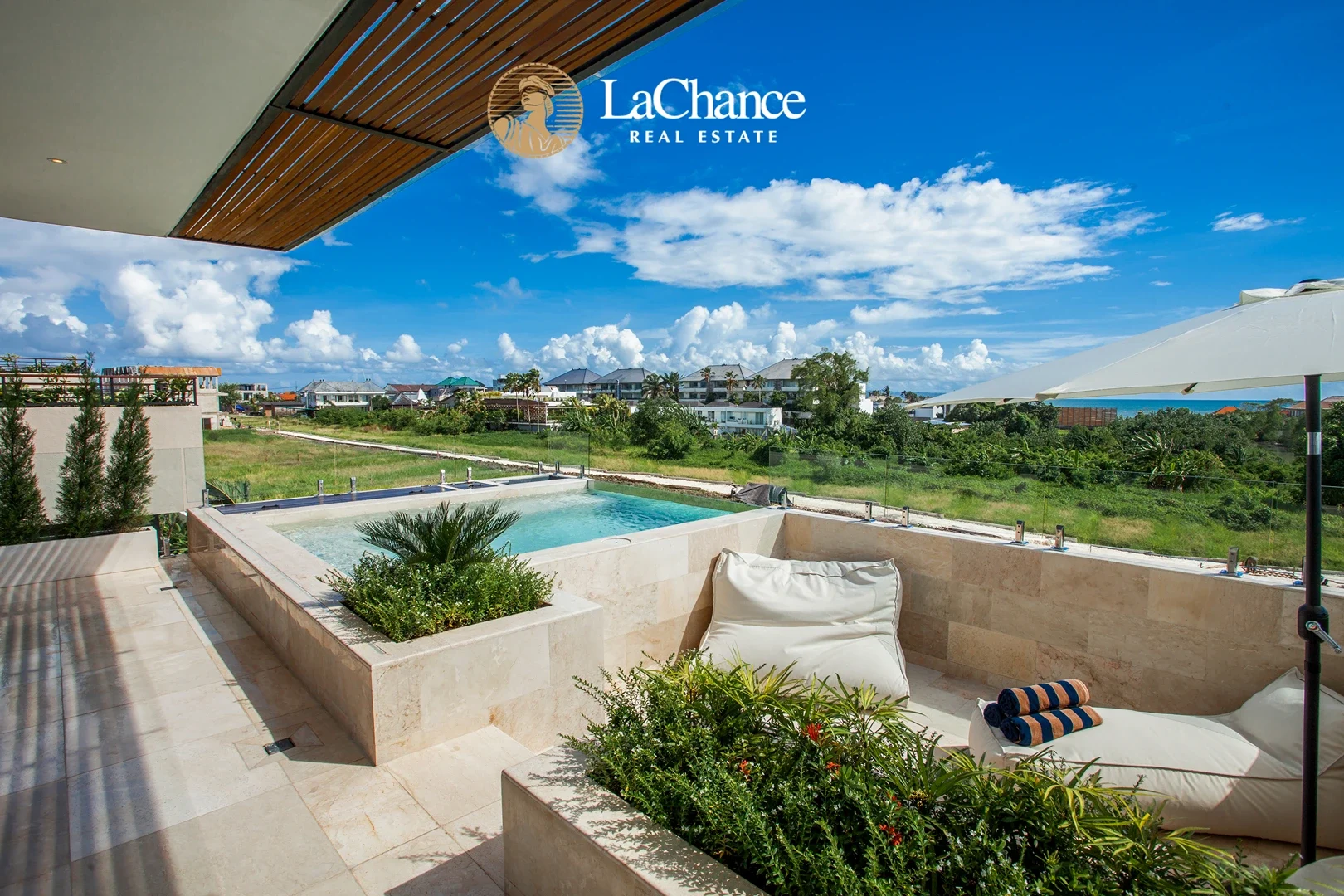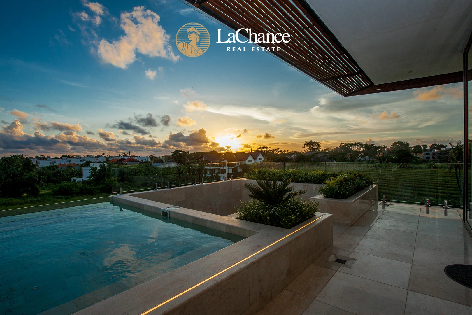 One of the most remarkable highlights of this property is the double swimming pool concept — a beautiful pool at ground level and an incredible rooftop pool with panoramic ocean views. The upper-level terrace, combined with the elevated plunge pool, offers one of the most breathtaking sunset experiences you can find in the area.