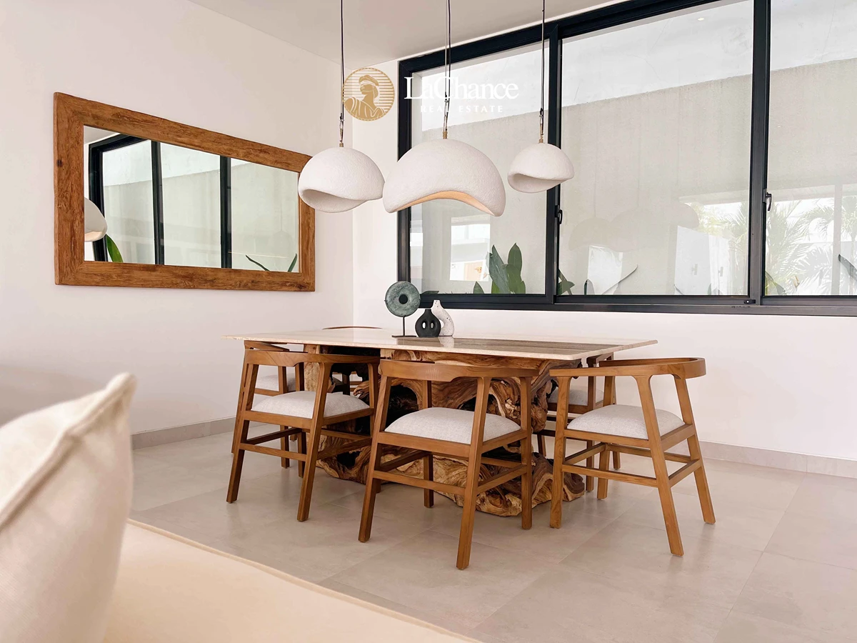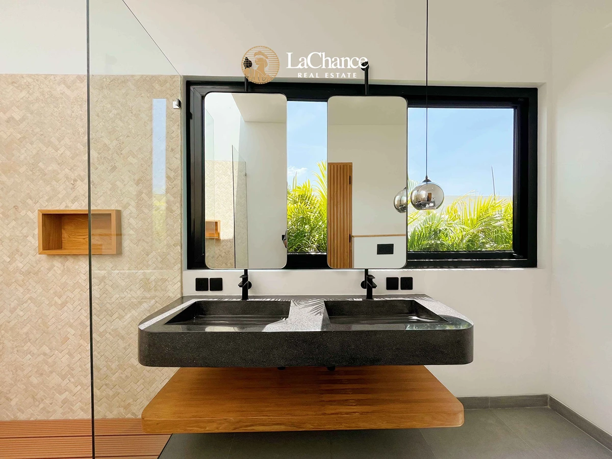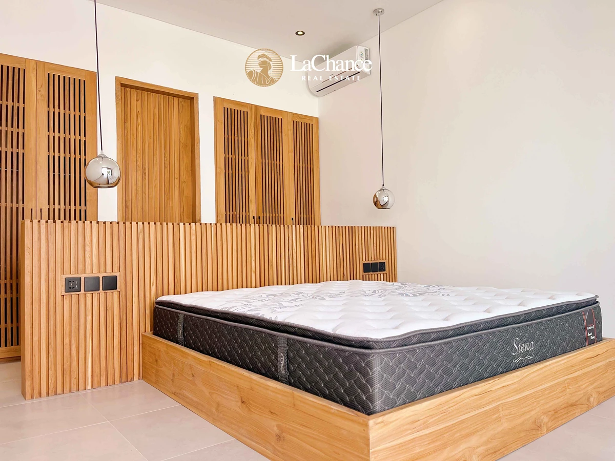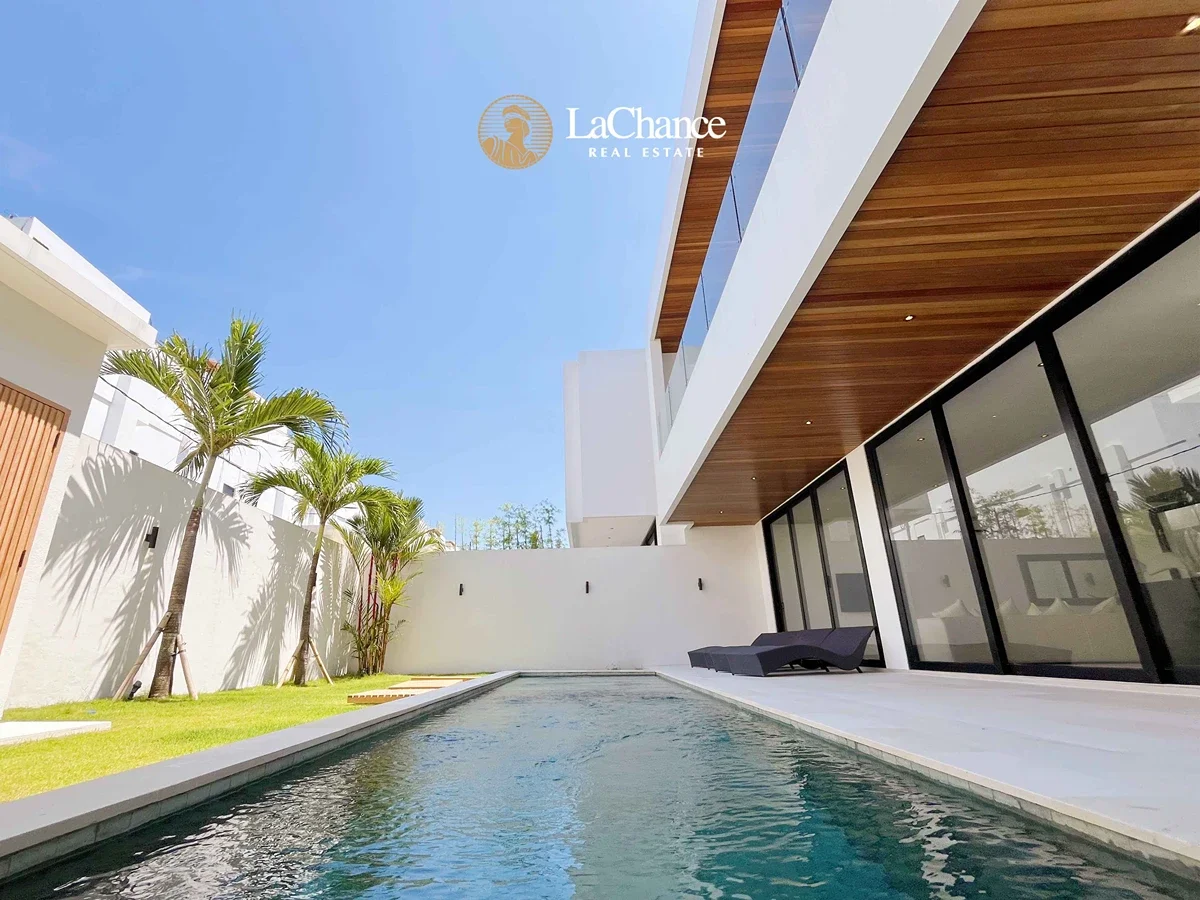 Every detail of this villa has been carefully studied and executed with high-quality materials and premium brands. Each of the four spacious bedrooms has its own en-suite bathroom, thoughtfully designed with double showers and double sinks for maximum convenience. The enclosed living room with a modern kitchen provides a bright, spacious, and comfortable environment for families or groups.